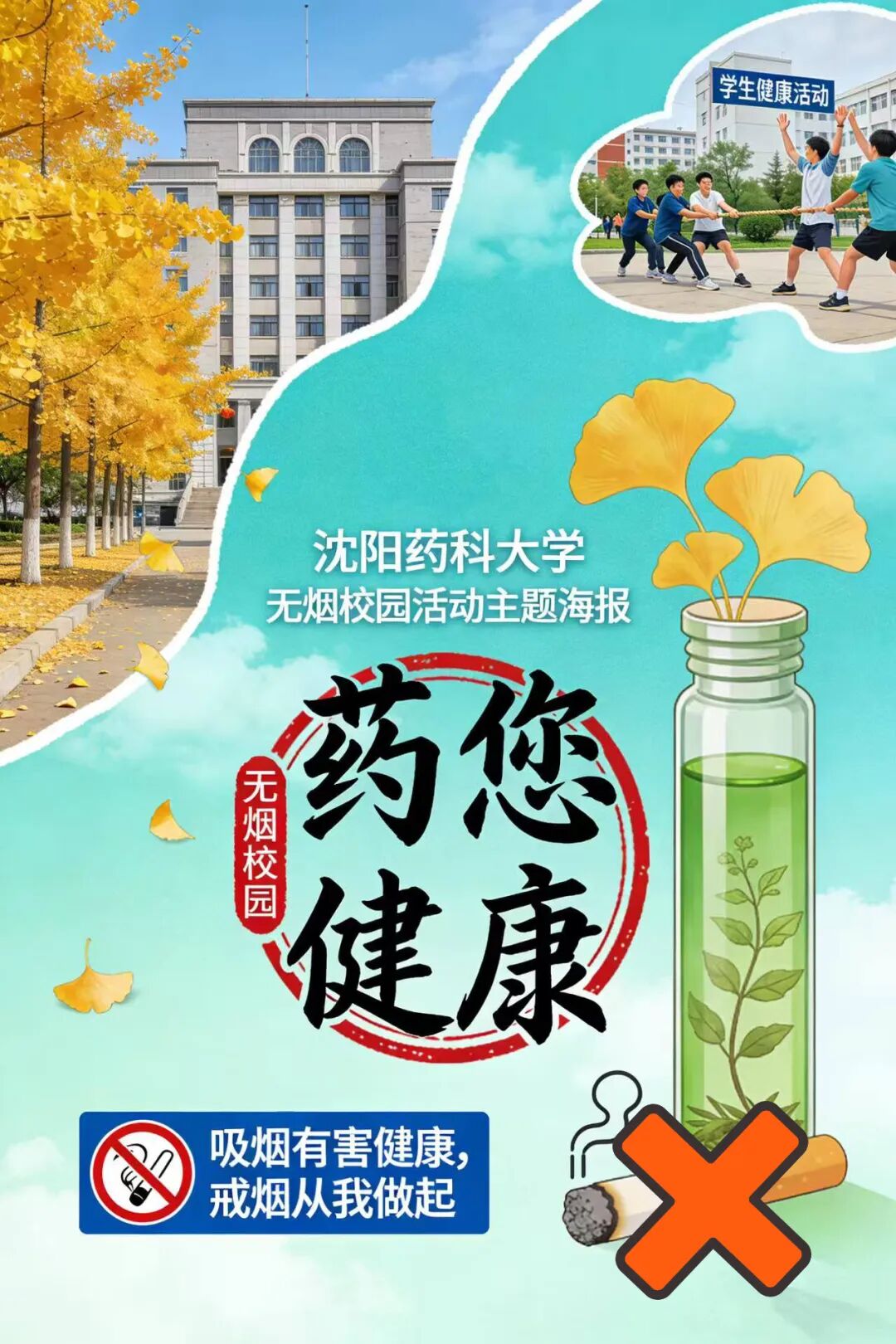 同学们,我们身为沈药学子,肩负着“守护健康”的使命与责任,更应从自身做起,珍爱健康,拒绝烟草。让我们立即行动起来,以青春之我,创无烟之境,携手营造一个远离烟雾、充满活力、安全和谐的校园环境,为创建清新文明的北国药苑贡献自己的一份力量!