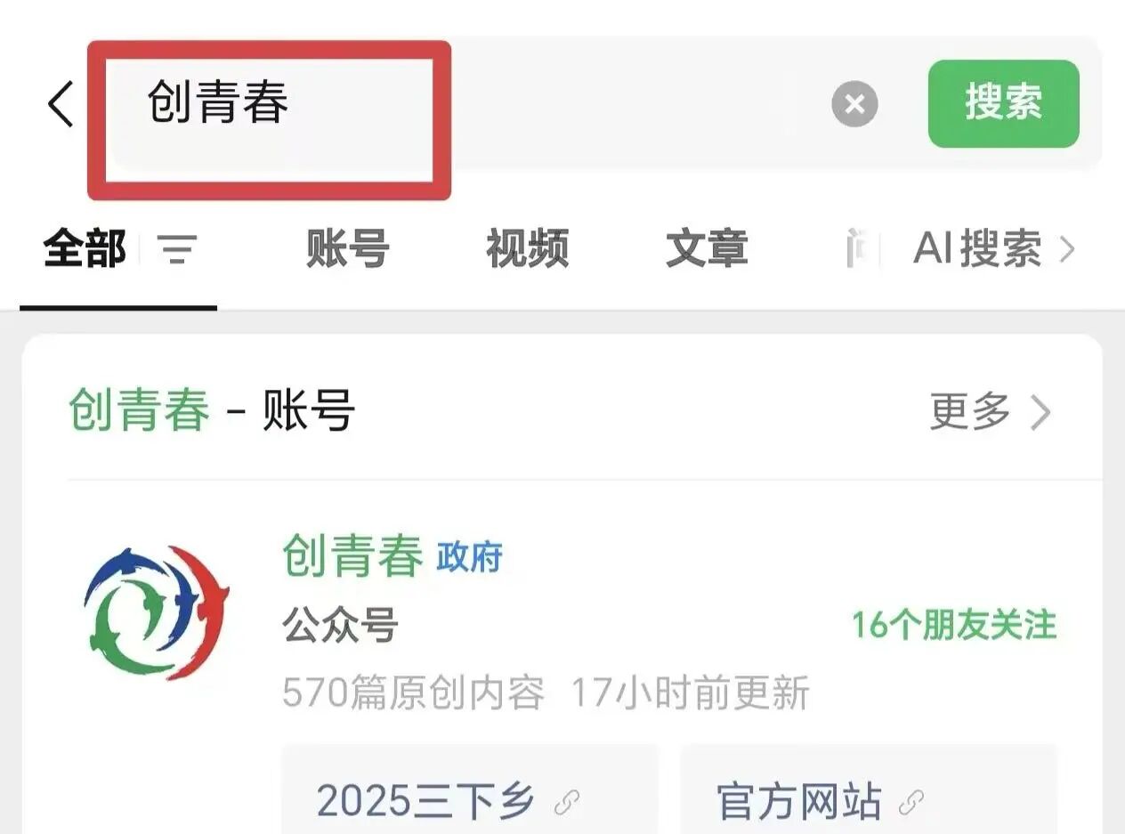 1.微信搜索“创青春”公众号,关注“创青春”微信公众号和家乡所在地的省、地市、县区的团组织微信公众号,阅读“返家乡”系列相关推文。