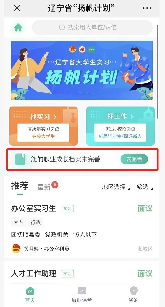 1.个人职业成长档案完成度达80%以上,即可首页【找实习】或【找工作】选择心仪岗位进行投递。